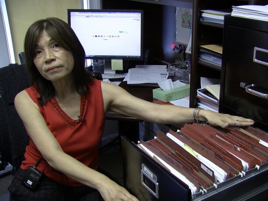 Carmen Kcomt, a legal advocate who leads the anti-human trafficking program at La Maestra Community Health Centers, points to the open cases in a filing cabinet the each represent a victim of human trafficking, April 27, 2017.