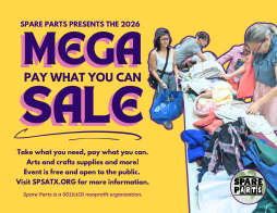 Take what you need, pay what you can. The Spare Parts 2026 Mega Pay-What-You-Can Sale provides the San Antonio community with access to school, office, and arts and craft supplies that have all been generously donated. This event is open to the public. Registration is not required but you will get a reminder if you do sign up.
