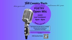 Join the Hill Country Poets Monthly Open Mic. Come share your work - Read a favorite poem - or just come and listen. Wonderful food and drinks available from Richter Boerne. Meet with us every 2nd Thursday next to the Boerne Book Shop. Everyone welcome.