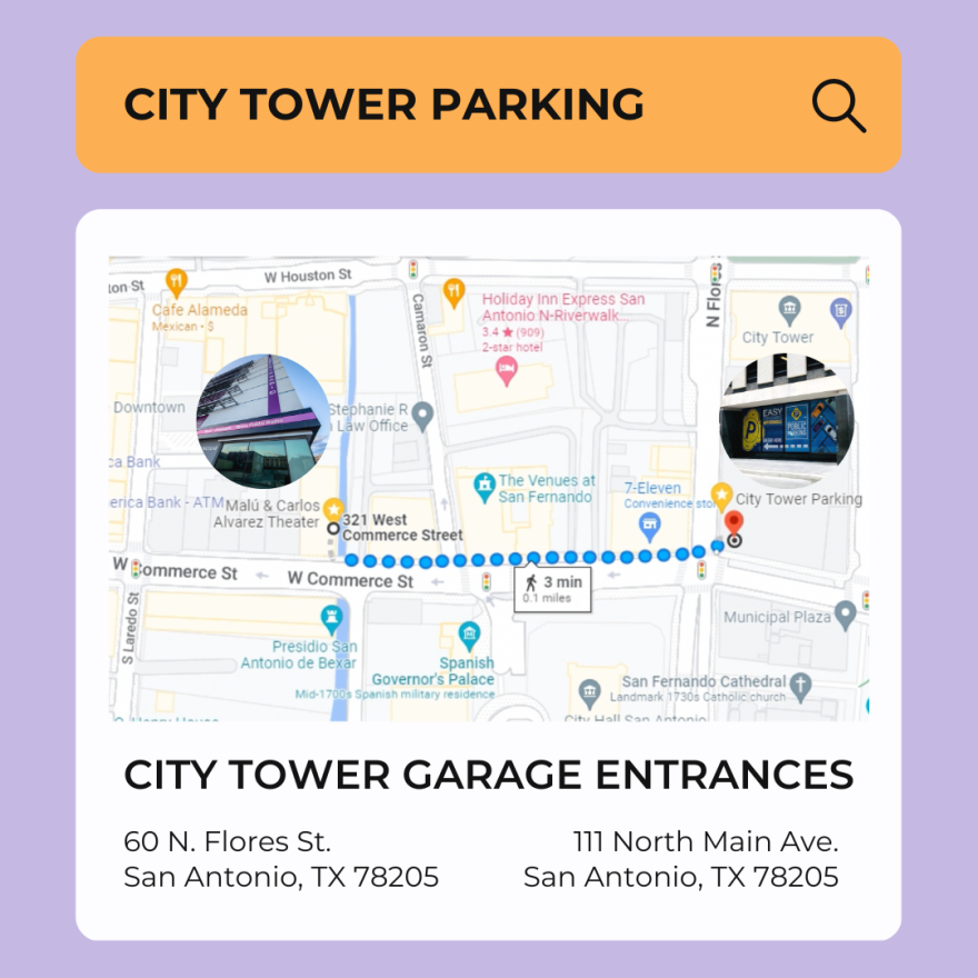 Free validated parking in the City Tower Garage at 60 North Flores. Another entrance is at 111 North Main. When entering the garage, take a ticket - do not insert your credit card. TPR is located two blocks west of the garage, along the San Pedro Creek.