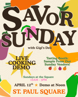 The April 12 edition includes the District’s first-ever Savor Sunday celebration, spotlighting local chefs and locally sourced ingredients. The inaugural event will feature a live cooking demonstration beginning at noon from local chef Matt Garcia of the award-winning GiGis Deli, offering small bites for attendees made using ingredients available at the St. Paul Square farmers market.