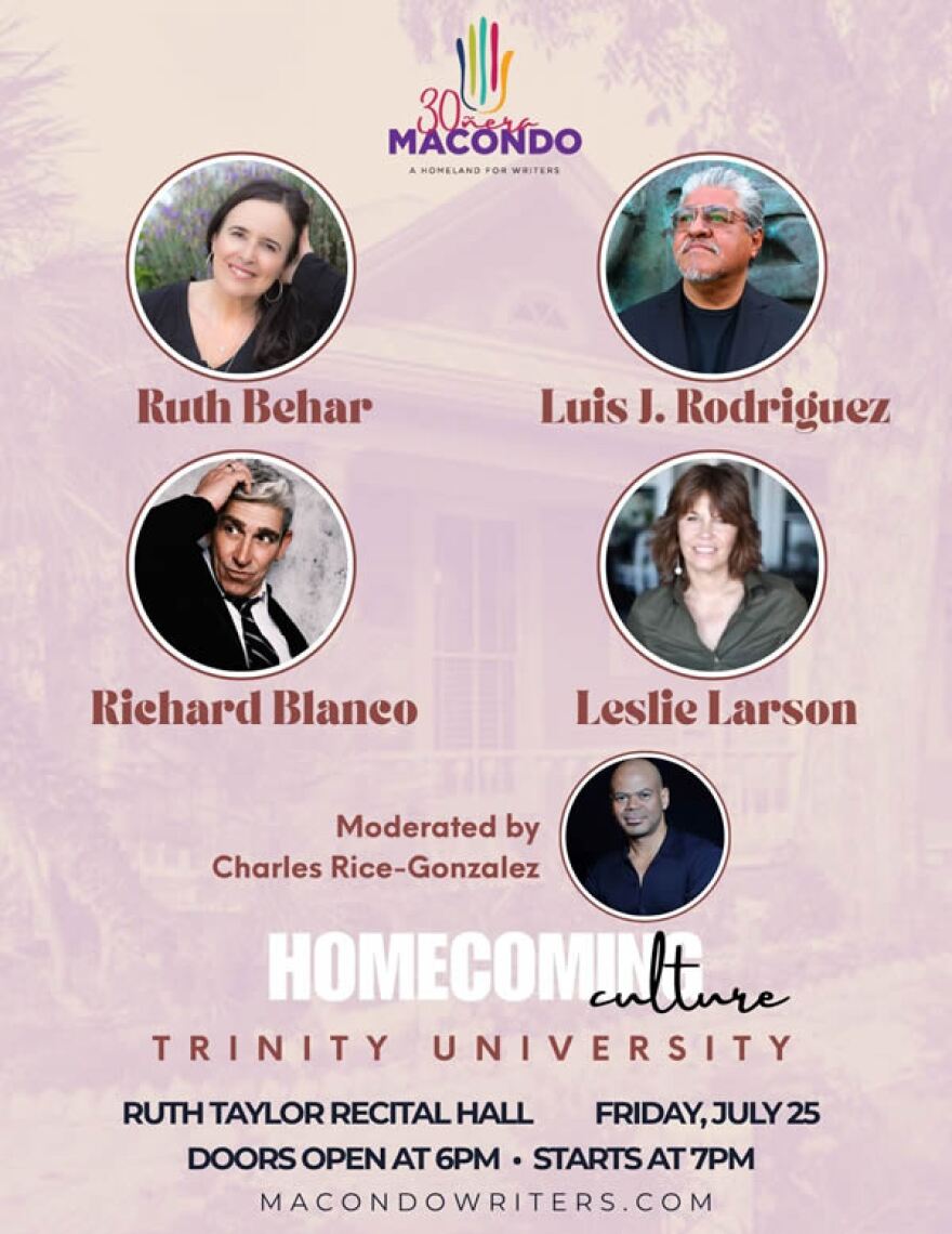 Richard Blanco was the inauguration poet for Barack Obama, and he has been with Macondo, I think, for about 20 or 30 years, actually. He has functioned as a Macondista, as a seminar leader, as faculty. A couple of years ago, he taught the poetry workshop, and he's coming back to participate in one of these public Homeland panels at Trinity University in the Ruth Taylor Hall.