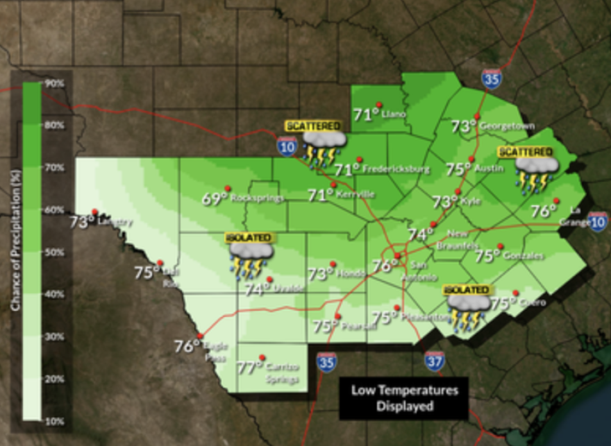 The Hill Country and the northern I-35 corridor will see the highest chances of isolated showers and thunderstorms on Sunday night and Monday morning. Low temperatures will range from the upper 60s to the mid 70s.