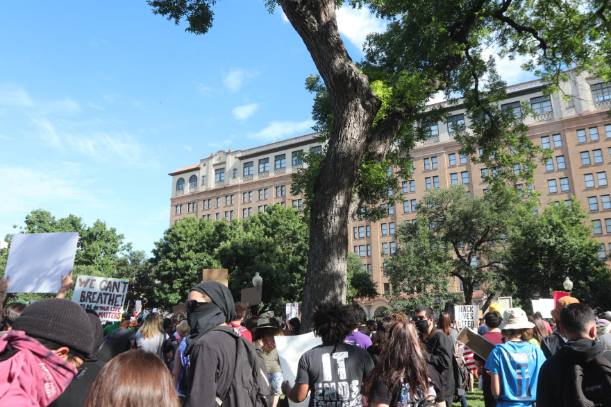 Mientras el alcalde y el juez del condado pronunciaban su sesión informativa nocturna sobre el COVID-19, una gran multitud de manifestantes marcharon desde su congregación en Travis Park hasta la Estación de Policía de San Antonio.