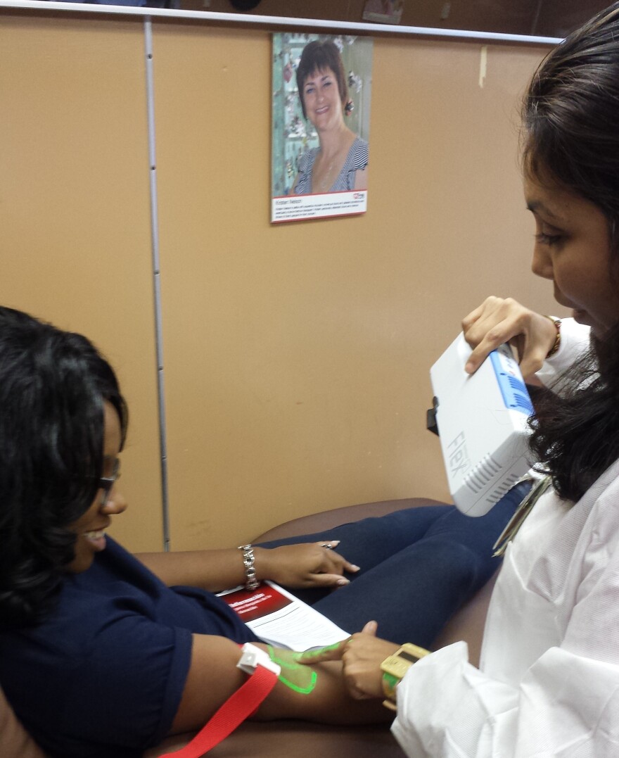 That new tool is called the VeinViewer Flex. This handheld instrument makes it easier for phlebotomists to find a vein and get it right on the first stick. The tool projects a green light on the surface of the skin that highlights the veins that's like seeing right through your skin. The technology isn’t new to the health care industry, but Clark says it is new to blood banking.